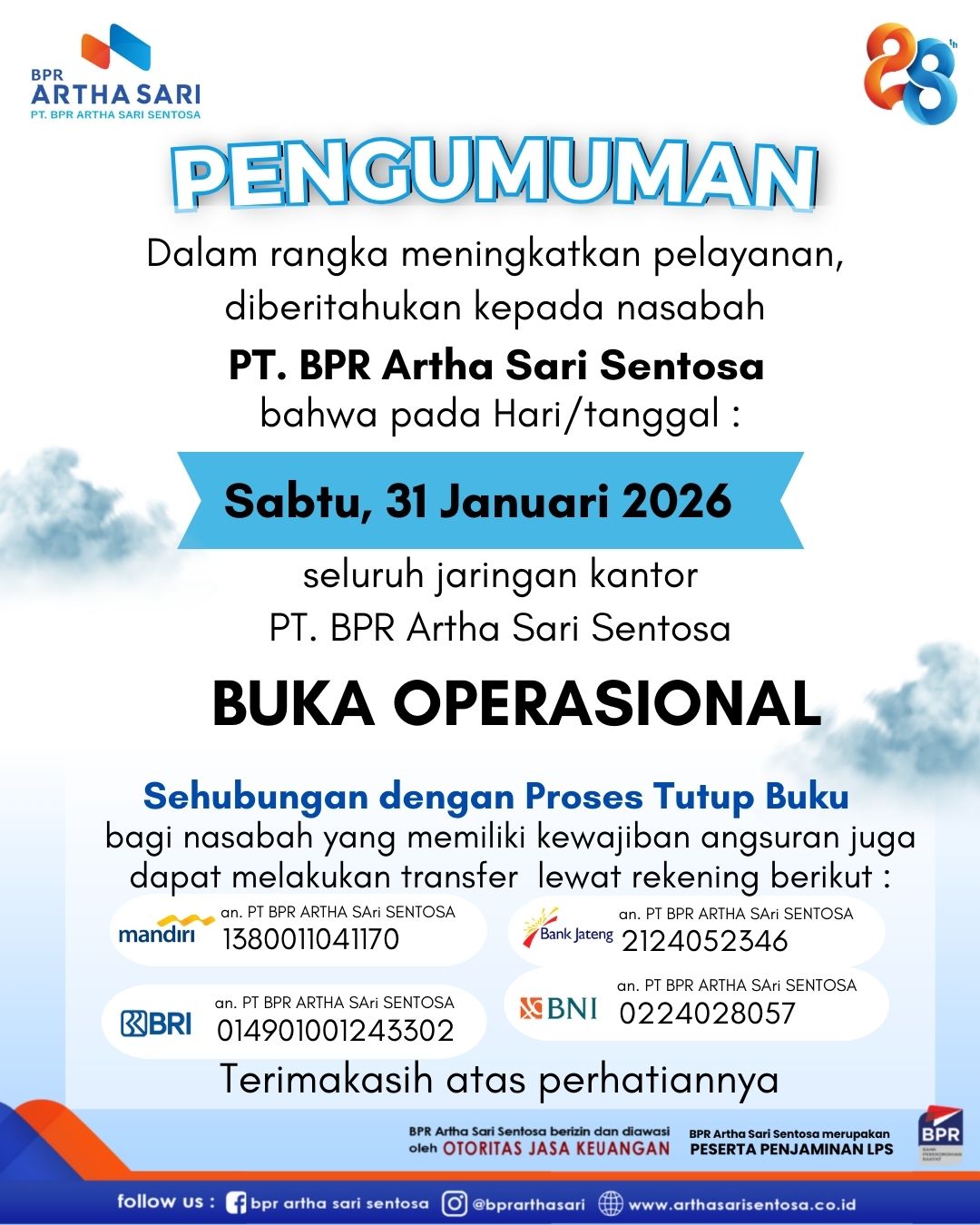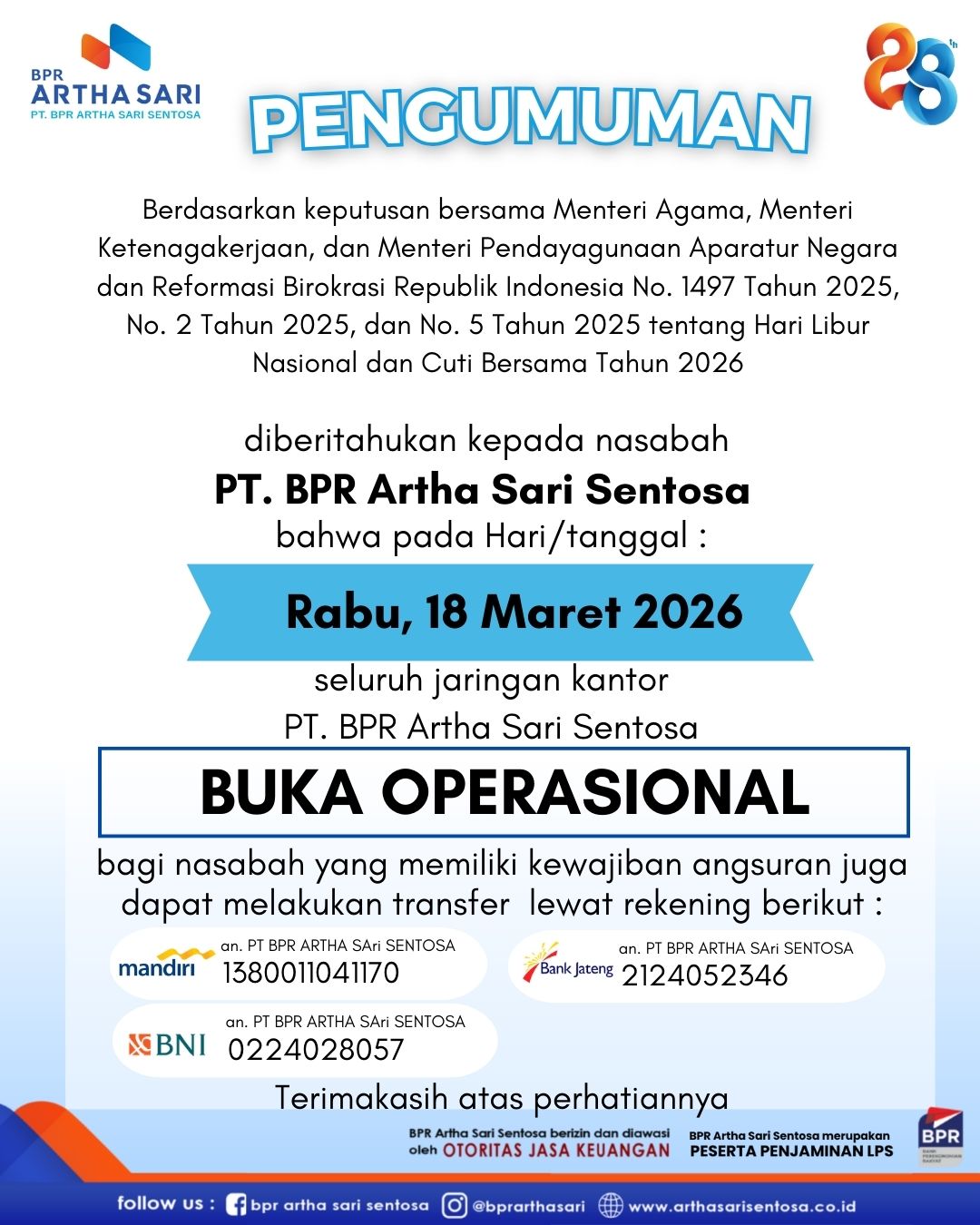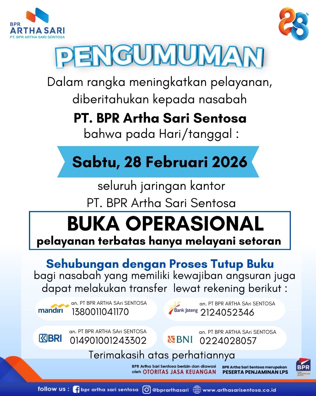Diberitahukan kepada Nasabah PT.BPR Artha Sari Sentosa, Pada tanggal 28 Februari 2026,