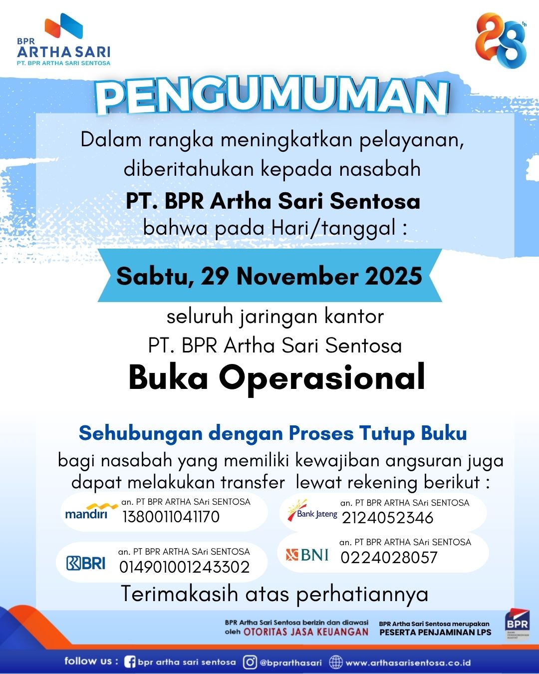 ? PENGUMUMAN LIBUR OPERASIONAL Untuk seluruh nasabah setia BPR Artha Sari Sentosa, kami informasikan