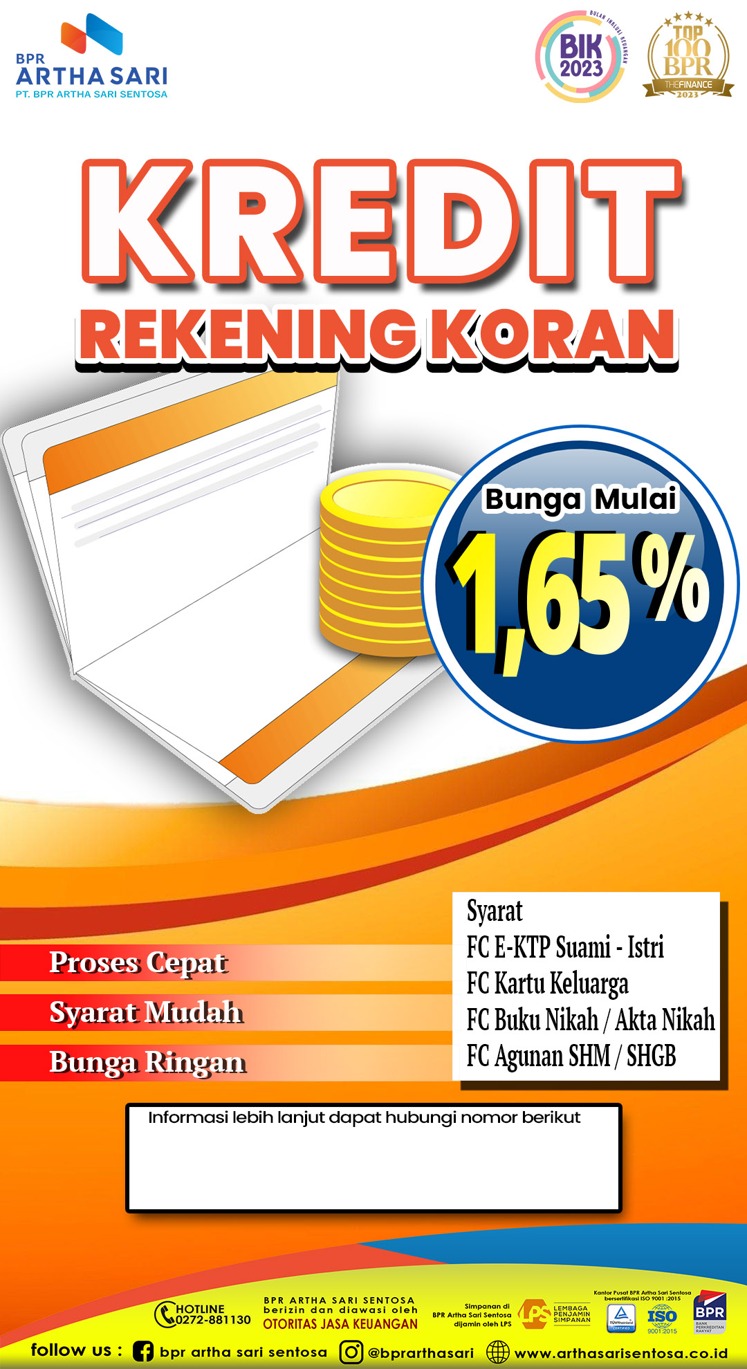 Kredit dengan sistem non angsuran ( kewajiban per bulan adalah bunga) yang dapat digunakan untuk memenuhi kebutuhan modal kerja, investasi dan konsumtif. Berlaku suku bunga efektif ( bunga harian dihitung dari sisa pokok pinjaman ). Pokok pinjaman bisa ditarik dan disetor sesuai batas kelonggaran tarik dalam fasilitas kredit rekening koran.