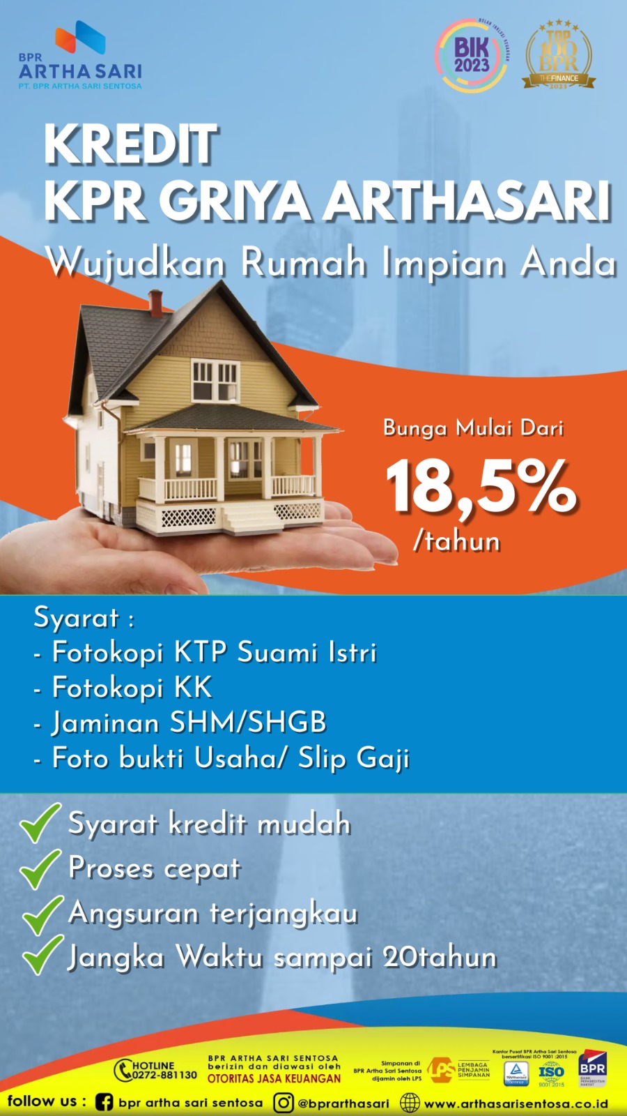 Kredit KPR Griya Artha Sari merupakan produk kredit pembiayaan pembelian rumah, ruko, kios baru. atau renovasi rumah, ruko, kios dan pembangunan rumah.