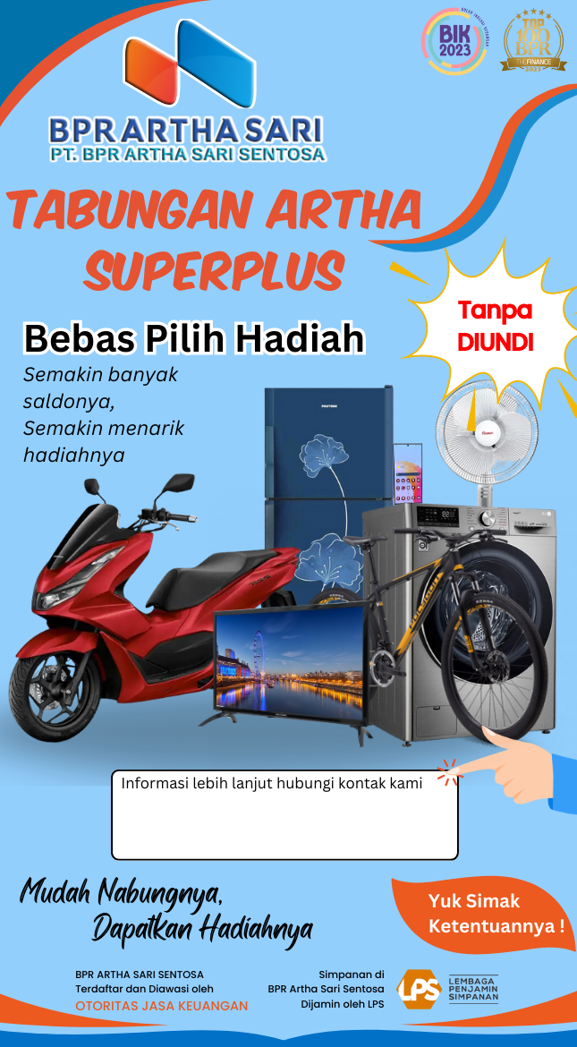Pilih saja investasi dalam bentuk tabungan yang aman dan terpercaya. TABUNGAN ARTHA PLUS adalah simpanan dalam bentuk tabungan dari PT BPR ARTHA SARI SENTOSA bagi masyarakat. Dengan fasilitas hadiah langsung tanpa diundi, serta merupakan simpanan yang praktis aman dan menguntungkan.